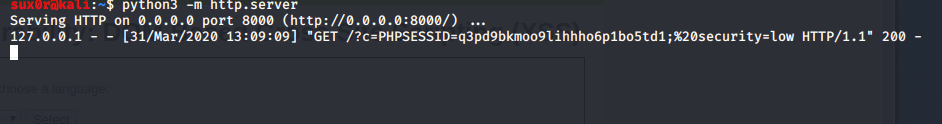 By default the python http server runs on port 8000. Now lets modify the URL to steal the session cookies: